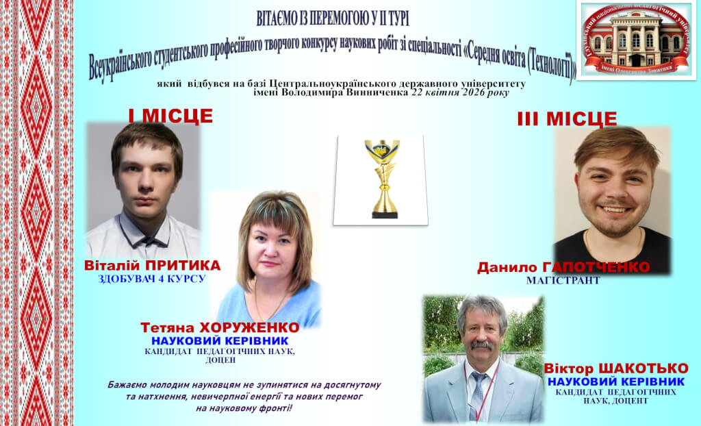 Вітаємо переможців ІІ туру Всеукраїнського студентського професійного творчого конкурсу наукових робіт зі спеціальності «Середня освіта (Технології)»! 🎉