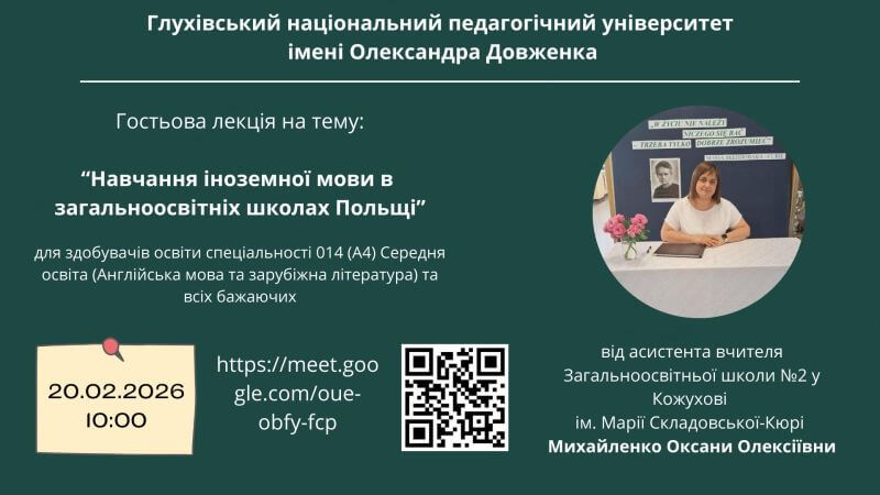 Запрошуємо студентів спеціальності 014 (А4) Середня освіта (Англійська мова та зарубіжна література) та всіх бажаючих на гостьову лекцію від асистента вчителя Загальноосвітньої школи №2 у Кожухові ім. Марії Складовської-Кюрі МИХАЙЛЕНКО Оксани Олексіївни на тему: «Навчання іноземної мови в загальноосвітніх школах Польщі», яка відбудеться 20 лютого о 10:00 за покликанням: