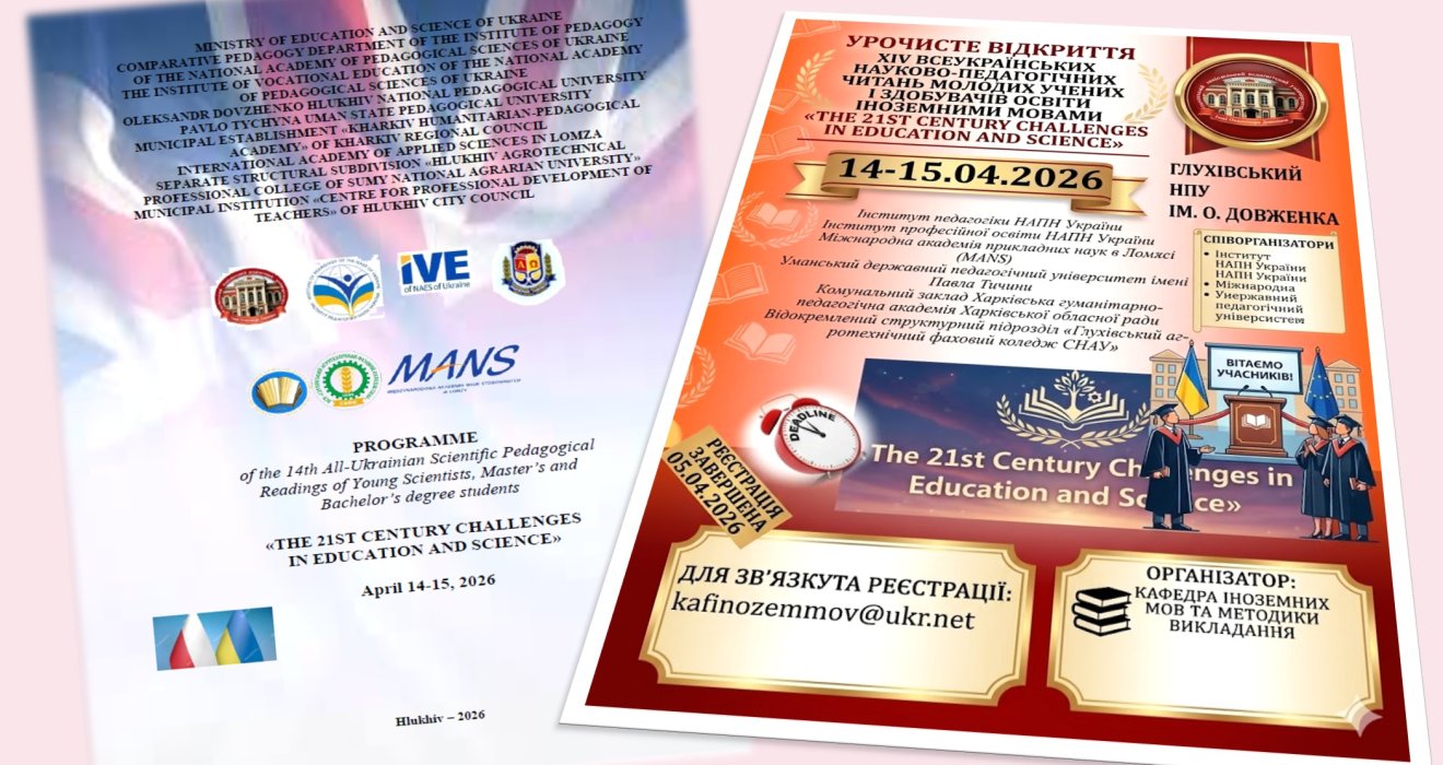 14 квітня 2026 року на базі Глухівського національного педагогічного університету імені Олександра Довженка розпочала роботу 14-та Всеукраїнська науково-педагогічна конференція молодих учених, магістрантів та бакалаврів «Виклики ХХІ століття в освіті та науці». Захід об’єднав представників провідних наукових та освітніх установ України, зокрема Інституту педагогіки та Інституту професійної освіти НАПН України, а також міжнародних партнерів із Польщі. Протягом двох днів учасники обговорюватимуть актуальні питання сучасної філології, методики викладання, гуманітаристики, природничих наук та професійної освіти в умовах глобальних змін. Програма заходу структурована за п’ятьма ключовими напрямами (секціями), що охоплюють широкий спектр наукових інтересів молодих дослідників.