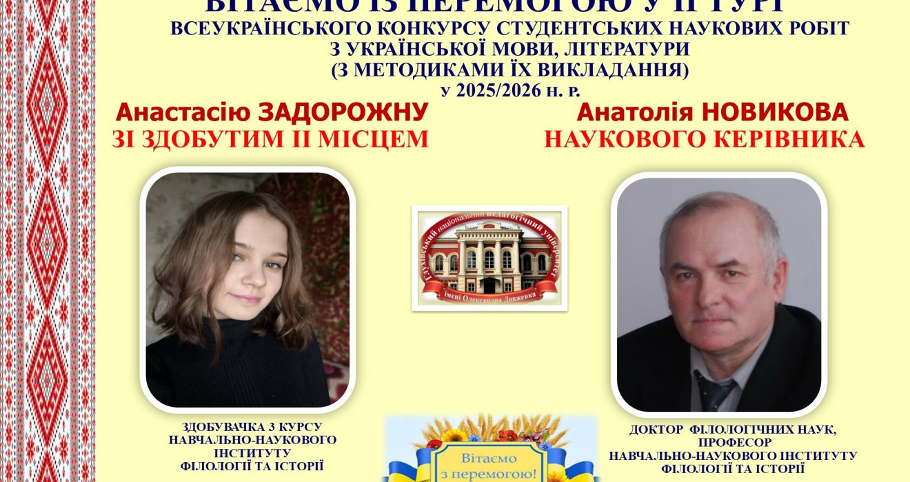 Адміністрація університету та колектив Навчально-наукового інституту філології та історії щиро вітають студентку 3 курсу (33-У група) Задорожну Анастасію із здобуттям почесного ІІ місця у Всеукраїнському конкурсі студентських наукових робіт з української мови, літератури (з методиками їх викладання) у 2025/2026 н. р.